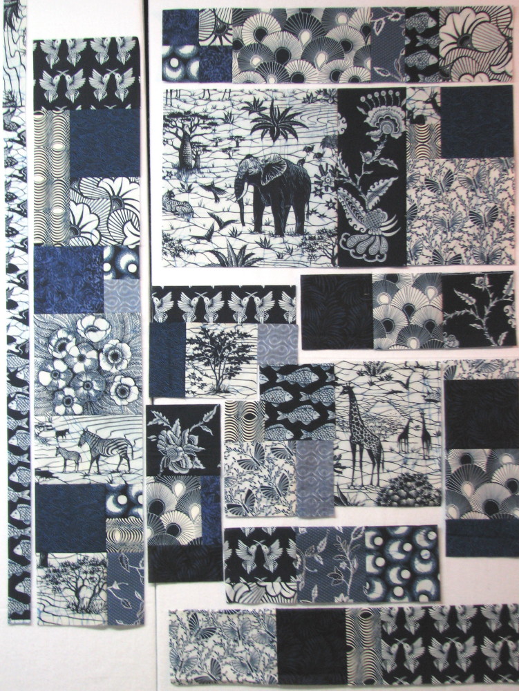 After you finalize your layout, start analyzing how you will sew it together. I had several sections that were simple to figure out so I sewed them first. Now the section in the middle (tree/fish/giraffe) is the tricky part that will need at least 2 partial seams to assemble it.